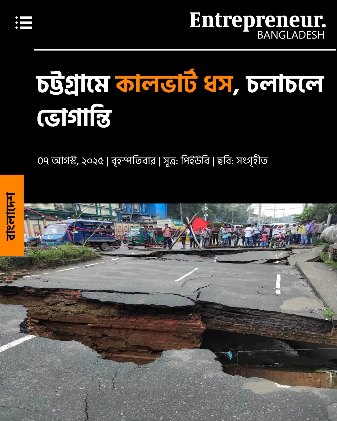 স্থানীয় বাসিন্দা জাহাঙ্গীর সাত্তার অভিযোগ করে বলেন, “কালভার্টটি এক বছর আগে থেকেই দেবে যাচ্ছিল। তৎকালীন সময়ে সিটি করপোরেশন শুধু টিন দিয়ে ঘিরে রেখেছিল, স্থায়ী সমাধান হয়নি।”