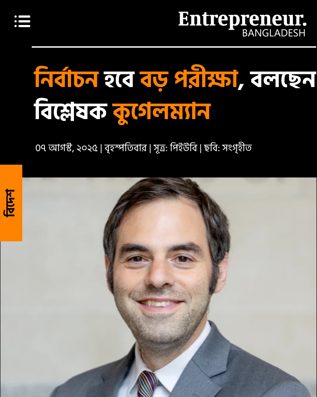 আসন্ন জাতীয় সংসদ নির্বাচনকে ‘শেখ হাসিনা-পরবর্তী বাংলাদেশ’-এর জন্য বড় ধরনের পরীক্ষা হিসেবে আখ্যায়িত করেছেন দক্ষিণ এশিয়াবিষয়ক বিশ্লেষক মাইকেল কুগেলম্যান। মার্কিন সাময়িকী ফরেন পলিসি-র ‘সাউথ এশিয়া ব্রিফ’ বিভাগে প্রকাশিত এক বিশ্লেষণধর্মী লেখায় তিনি এমন মন্তব্য করেন।