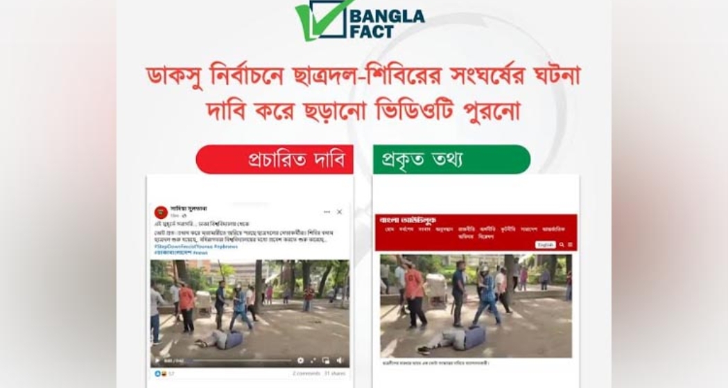 ঢাকা বিশ্ববিদ্যালয় কেন্দ্রীয় ছাত্র সংসদ (ডাকসু) নির্বাচনের পর ছড়িয়ে পড়া একটি ভিডিওকে ভুয়া বলে শনাক্ত করেছে প্রেস ইনস্টিটিউট বাংলাদেশ (পিআইবি) এর ফ্যাক্ট চেক টিম বাংলাফ্যাক্ট। ওই ভিডিওতে দাবি করা হয়েছিল যে, ছাত্রশিবির ও ছাত্রদল ডাকসু নির্বাচনে ভোট প্রত্যাখ্যানের পর সংঘর্ষে জড়িয়ে পড়েছে। তবে বাংলাফ্যাক্টের যাচাইয়ে এটি পুরোনো ভিডিও হিসেবে শনাক্ত হয়েছে, যা ২০২৪ সালের ১৫ জুলাই গণঅভ্যুত্থানের সময় আন্দোলনরত শিক্ষার্থীদের ওপর ছাত্রলীগের হামলার দৃশ্য।
