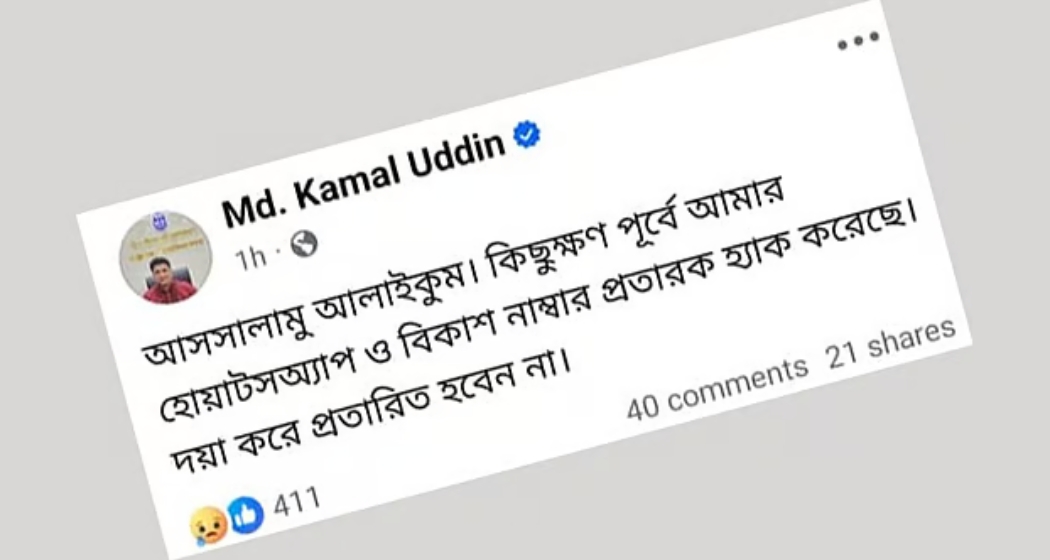 “আসসালামু আলাইকুম, কিছুক্ষণ পূর্বে আমার হোয়াটসঅ্যাপ ও বিকাশ নাম্বার প্রতারক হ্যাক করেছে। দয়া করে প্রতারিত হবেন না।”