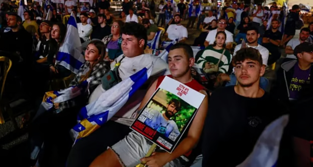 কেউ হাতে নিয়ে ছিলেন ইসরায়েলি পতাকা, কেউবা প্রিয়জনের ছবি ও নাম লেখা ব্যানার—