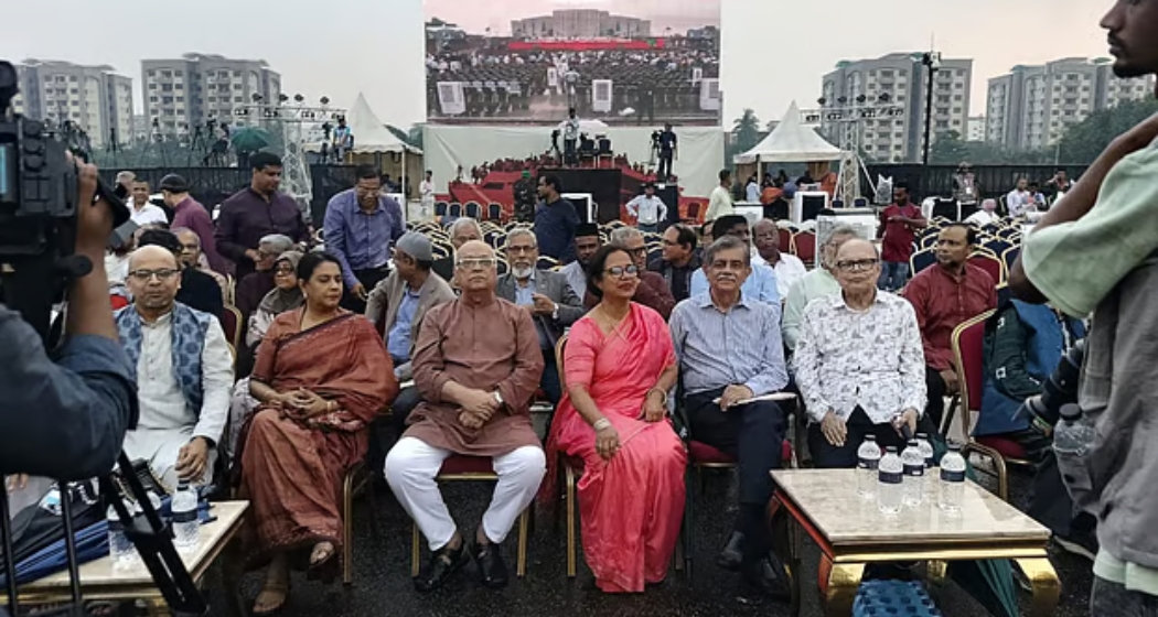 অনুষ্ঠানে বিকেল সাড়ে চারটার দিকে মঞ্চে আসেন অধ্যাপক ইউনূস। তাঁর সঙ্গে ছিলেন আইন উপদেষ্টা আসিফ নজরুল, সংস্কৃতি উপদেষ্টা মোস্তফা সরয়ার ফারুকী এবং জাতীয় ঐকমত্য কমিশনের সহ–সভাপতি আলী রীয়াজ।