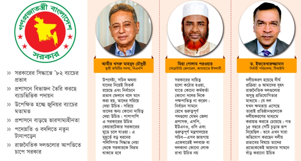 জাতীয় নির্বাচনকে সামনে রেখে দেশের প্রশাসন ও গুরুত্বপূর্ণ দপ্তরগুলোতে রদবদল ও পুনর্গঠন প্রক্রিয়া ত্বরান্বিত হয়েছে। তবে এই প্রক্রিয়ার সঙ্গে যুক্ত কিছু কর্মকর্তা ও উপদেষ্টাদের নিরপেক্ষতা নিয়ে প্রশ্ন উঠেছে। বিশেষ করে প্রশাসন ক্যাডারের ১৯৮২ ব্যাচের কর্মকর্তাদের ভূমিকা নিয়ে রাজনৈতিক দলগুলোর মধ্যে বিতর্ক তীব্র হয়ে উঠেছে।